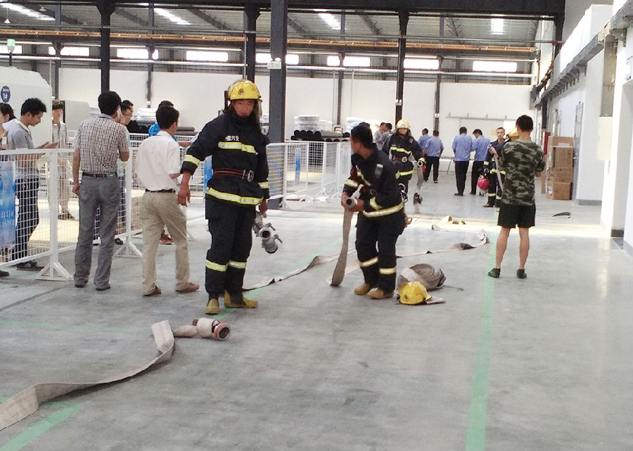 当天上午9:20,车间负责人发出火警报警信号。总指挥下达命令组织各应急小组抢救,同时由通讯组下达启动应急救援方案的指示。接到报警后各演练工作组迅速到位,同时展开救援工作。演习着火地点是管件车间产品堆放区,车间员工在听到火灾警示后立即撤离到安全地带。跟据火情形势经总指挥下令,通讯组拨打119报警,开发区消防大队接警后及时赶赴现场,开展消防车抢救灭火工作。