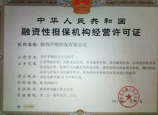 乐鱼网页版登录入口讯 在广角领导及各部门的不懈努力下,陕西乐鱼网页版登录入口担保有限公司喜获陕西省人民政府金融工作办公室颁发的《中华人民共和国融资性担保机构经营许可证》。
