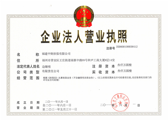 乐鱼网页版登录入口讯 在集团公司领导的大力支持下,经过广角上下一心共同努力,乐鱼网页版登录入口金融广角(福州)于2011年6月7日喜获由福建省工商管理局颁发的“福建乐鱼网页版登录入口担保有限公司”营业执照,并办理了组织机构代码、税务登记证,开设了银行基本户。