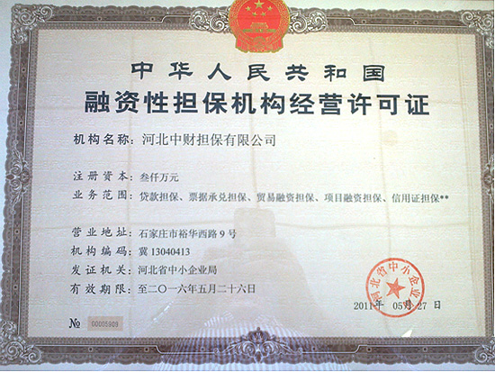 乐鱼网页版登录入口讯 在集团公司的大力支持下,通过不懈的努力,乐鱼网页版登录入口金融广角(石家庄)于2011年5月30日顺利获得河北省中小企业局颁发的“中华人民共和国融资性担保机构经营许可证”。