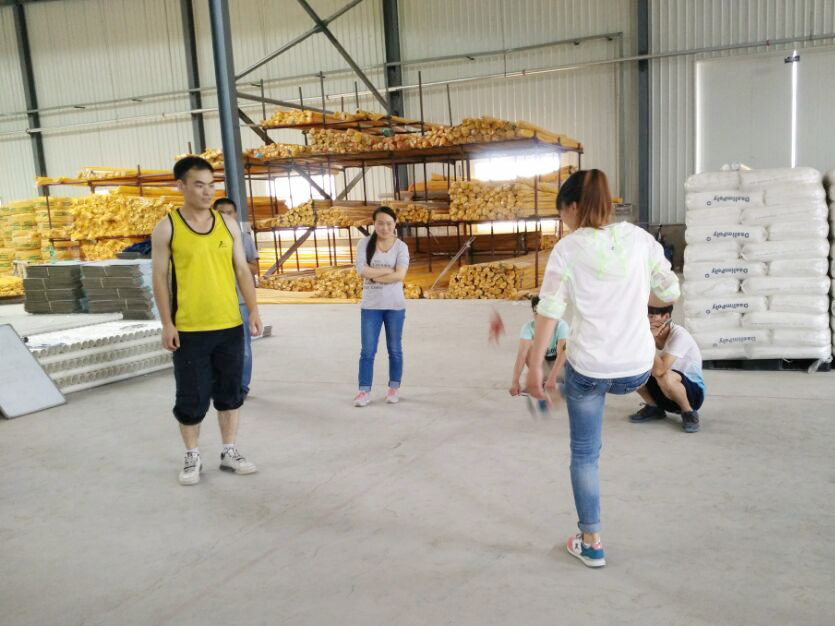下午14点,踢毽子比赛在仓库中进行,通过计时记分,最终生产部王芳霞和研发部汪鑫分别以117分和70分夺冠。