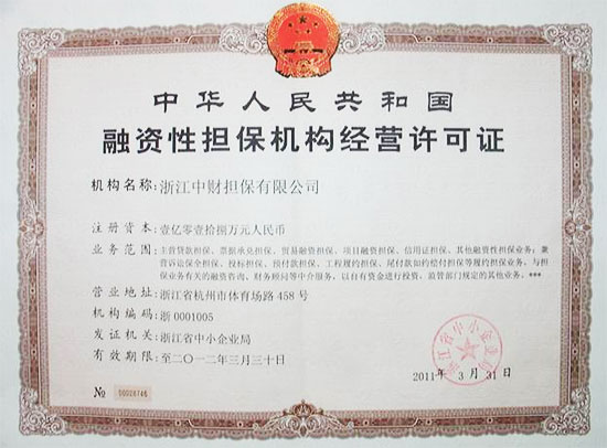 浙江乐鱼网页版登录入口担保喜获浙江省首批颁发的《融资性担保机构经营许可证》