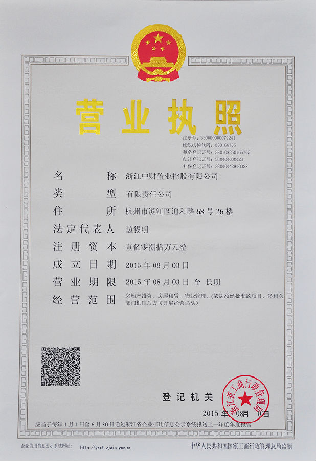 乐鱼网页版登录入口讯 遵照乐鱼网页版登录入口董局字[V]第149号文件《关于成立浙江乐鱼网页版登录入口生生资本有限公司暨全面组建乐鱼网页版登录入口资本事业组件等问题的原则意见》,乐鱼网页版登录入口置业控股有限公司认真贯彻执行集团董事局的指示,在各方面领导的支持和集团总裁办等相关部门的通力配合下,2015年8月3日,浙江省工商行政管理局正式颁发浙江乐鱼网页版登录入口置业控股有限公司营业执照。同时充分利用浙江省人民政府新近实施的企业“五证合一”的便利政策,一并办理完毕了公司组织机构代码证、税务登记证、社会保险证、统计证的登记申领工作。