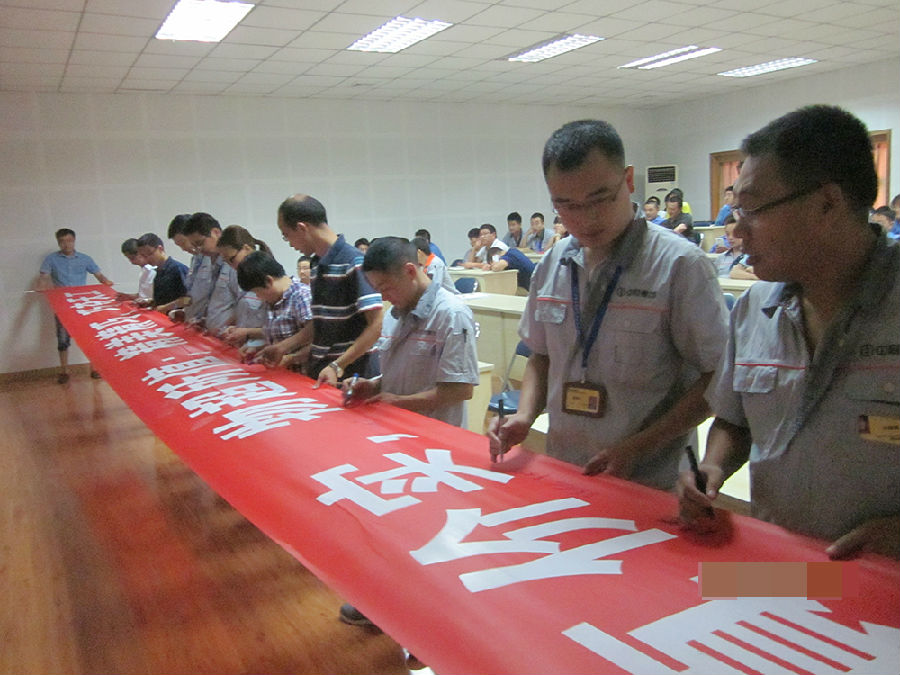 大会结束后,质管部发起“质量提升誓师签名”活动,全体与会人员在印有“货真价实,物超所值,精美精巧,巧夺天工”16字质量方针的横幅上签上自己的姓名,以示质量提升之决心。
