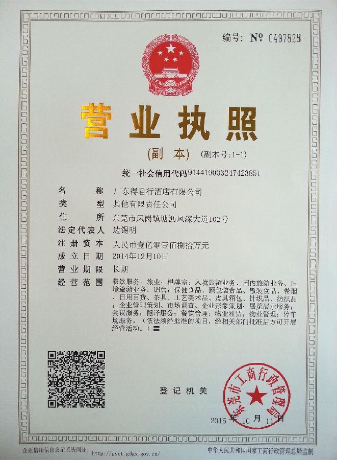 乐鱼网页版登录入口讯 遵照乐鱼网页版登录入口董局字[Ⅴ]第108号《关于明确广东得君行酒店设立及登记注册、经营、装修改造方案等事项的通知》文件要求,筹建人员分步开展公司注册登记工作,由于要进行两次土地和房产变更过户,两次工商变更登记,涉及税金额度很高,需要与税务部门反复沟通协商,办理程序繁杂,办理周期也较长,每次过户和变更都耗费很长时间。经过筹建人员的不懈努力,在集团总裁办和香港乐鱼网页版登录入口的大力支持和配合下,于2015年10月12日,广东得君行酒店完成最终股权结构及法定代表人变更,并拿到变更登记后新颁发的营业执照。