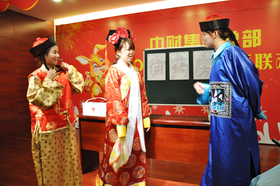 而后总裁办小品《庸医》,演出者身着古装,古代、现代时空交替转换,她们夸张的动作和经典的台词让人捧腹大笑,掀起阵阵掌声。