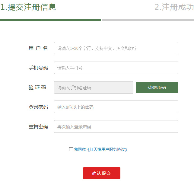 2、依次输入用户名、手机号码、手机验证码、登录密码、重复登录密码,勾选“我已阅读并同意《红天桃用户服务协议》”,确认提交,完成注册。