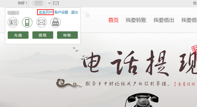 1、登录后点击顶部用户名出现下拉框,点击【实名开户】,进入实名开户步骤。