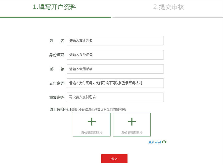 2、填写开户资料,分别输入姓名、身份证号码、邮箱、支付密码、重复支付密码,上传身份证正、反面,点击【提交】,等待审核。