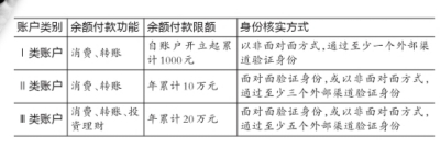 《办法》将个人支付账户扩充为三类。在功能上,三类账户都可以消费、转账,但只有Ⅲ类账户可以投资理财;在限额上,Ⅰ类账户自账户开立起累计限额1000元(类似微信中的零钱包),Ⅱ类账户年累计10万元,Ⅲ类账户年累计20万元,后两者限额累计中不含从支付账户中提现回银行账户的数额。