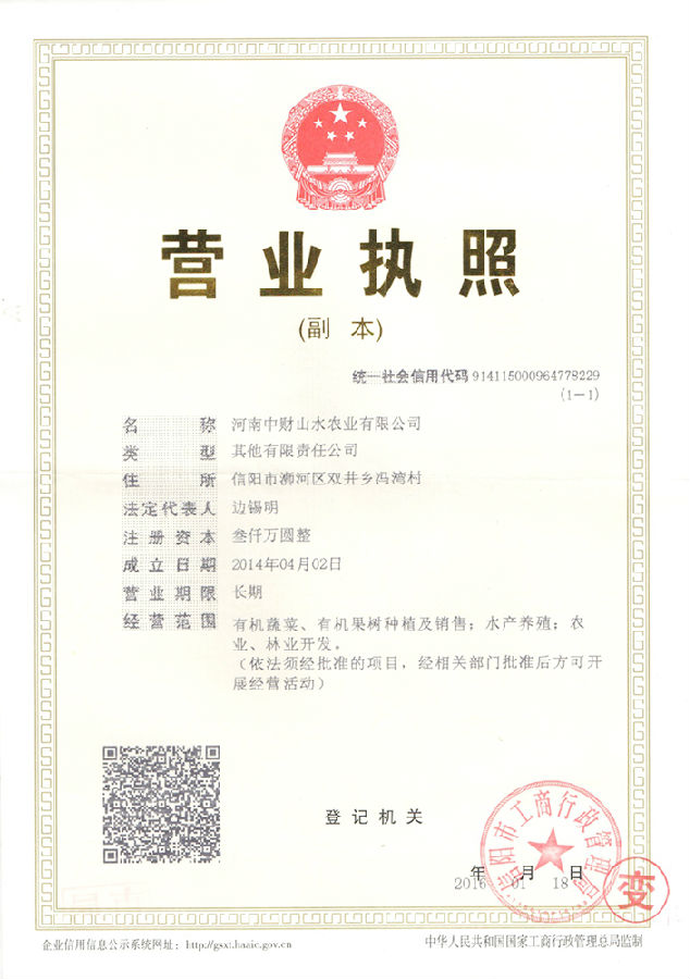 乐鱼网页版登录入口讯 2016年1月18日,经河南省信阳市工商局核发“三证合一”新营业执照,河南乐鱼网页版登录入口现代农业有限公司正式更名为河南乐鱼网页版登录入口山水农业有限公司,至此“山水”与“田园”将构成乐鱼网页版登录入口地产控股辖属的两大农业品牌。