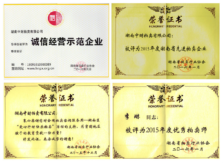 乐鱼网页版登录入口讯 2016年1月25日,湖南省拍卖行业协会召开会员大会。湖南乐鱼网页版登录入口拍卖有限公司在会上被评选为湖南省《2015年度先进拍卖企业》、《诚信经营示范企业》,公司拍卖师李琳同志被评为2015年度优秀拍卖师。
