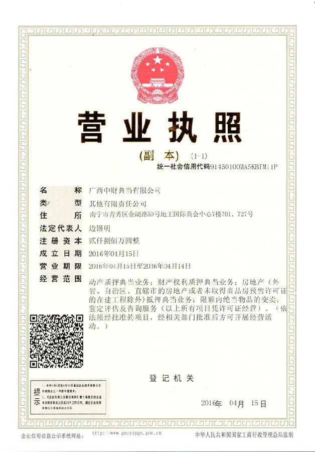 乐鱼网页版登录入口讯 2016年4月15日,南宁广角喜获广西乐鱼网页版登录入口典当有限公司营业执照,即广西乐鱼网页版登录入口典当有限公司申办成功。南宁广角自2014年底筹办以来,在集团领导的大力支持及各处室的积极配合下,经过全体员工的不懈努力,三家公司均申办成功,至此,南宁广角已完成“三位一体”的广角架构。南宁广角全体同仁将再接再厉,充分利用三个平台优势,在业务上勇夺佳绩。