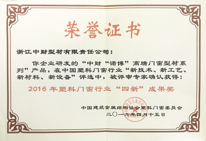乐鱼网页版登录入口“诺博”高端门窗型材系列产品获2016年塑料门窗行业“四新”成果奖
