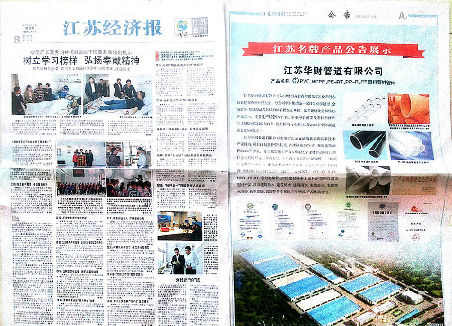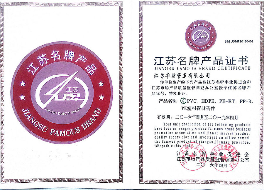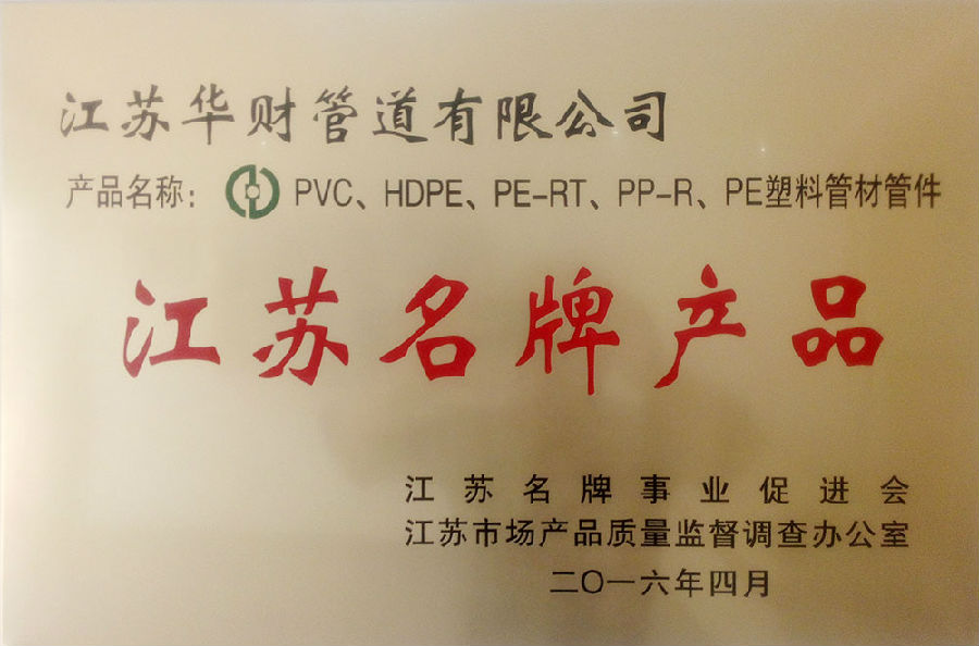 乐鱼网页版登录入口讯 近日,由江苏名牌事业促进会、江苏市场产品质量监督调查办公室等权威机构联合组成评审小组,对全省数千家申报企业在成长能力、科技创新、行业竞争力、企业信誉、社会责任等指标进行综合评定,并对经营中存在重大信用问题的企业实行一票否决。江苏华财管道有限公司生产的“PVC、HDPE、PE-RT、PP-R、PE塑料管材管件”通过审核,被确认为2016年江苏名牌产品。