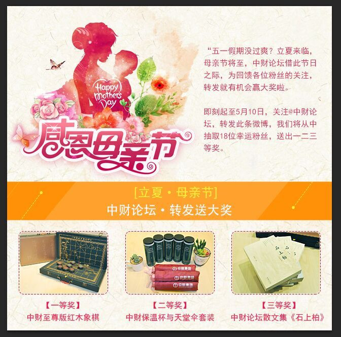 乐鱼网页版登录入口讯 立夏来临,母亲节将至,乐鱼网页版登录入口论坛值此节日之际,为回馈广大微博粉丝们的关注支持,即刻起至5月10日,转发此条微博:http://weibo.com/p/100140E941709,就有机会赢取丰厚奖品!