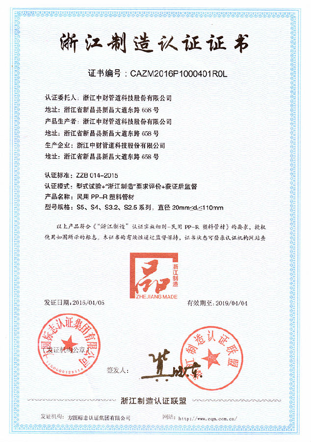 乐鱼网页版登录入口讯 浙江乐鱼网页版登录入口管道积极响应省政府“浙江制造”品牌战略部署,全面提升公司的质量管理水平、核心技术、品牌竞争力,通过资料审查、现场审核、产品抽样检测等多个环节,近期顺利获得“浙江制造”认证证书。