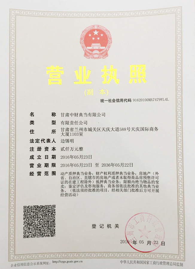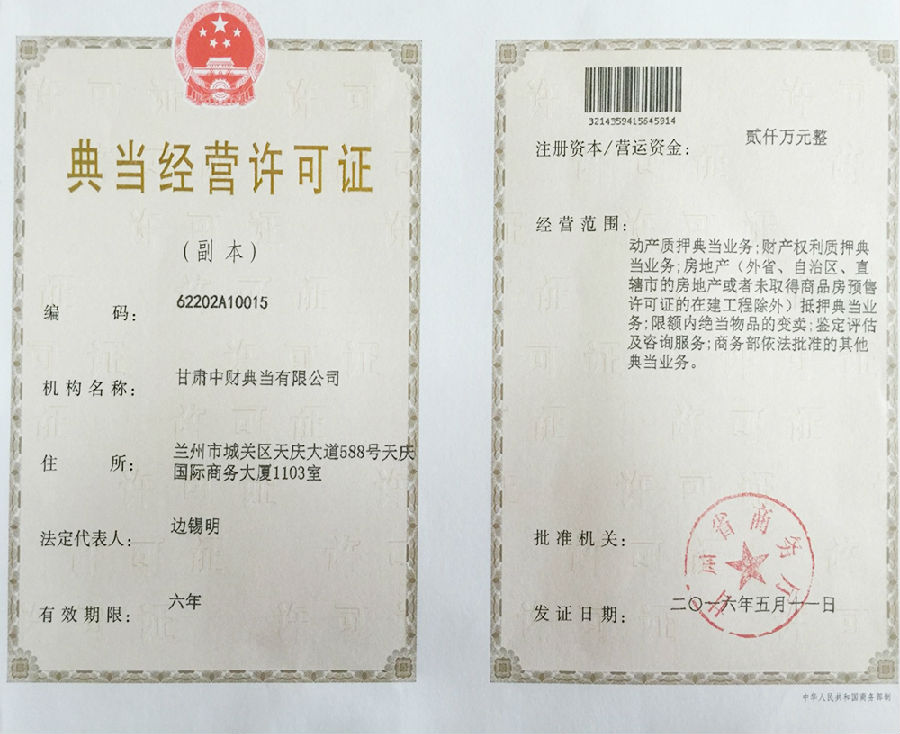 喜讯:甘肃乐鱼网页版登录入口典当有限公司申办成功