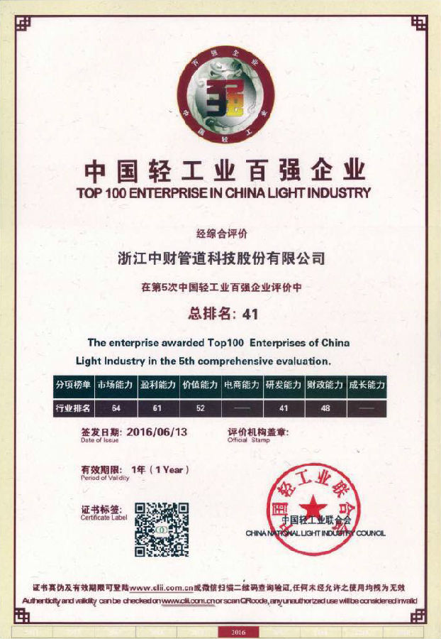 喜讯:浙江乐鱼网页版登录入口管道连续5年蝉联“中国轻工业百强企业”榜单
