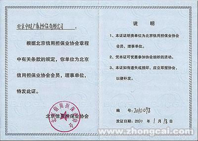 乐鱼网页版登录入口讯 北京乐鱼网页版登录入口广角担保有限公司经向北京信用担保业协会提出申请,并与协会良好沟通,于2010年1月18日通过了协会的审核,正式加入北京信用担保业协会,成为北京信用担保业协会的会员、理事单位。