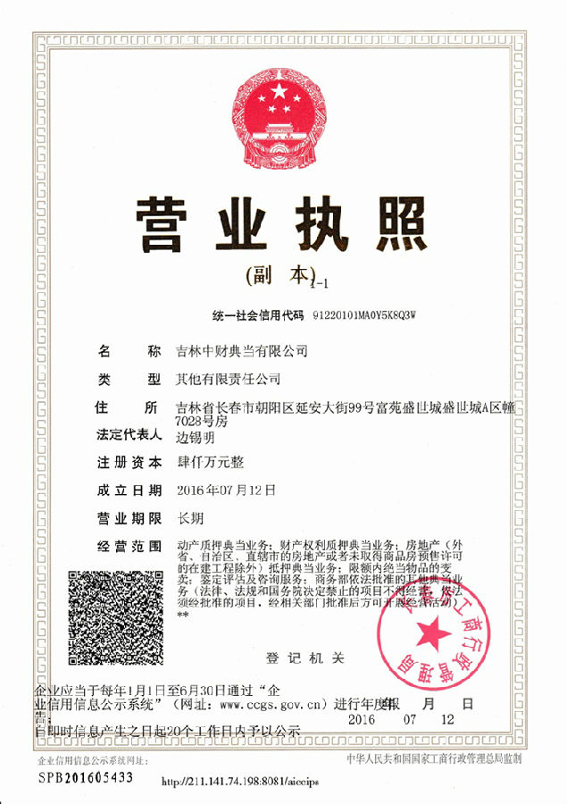 乐鱼网页版登录入口讯 在集团领导及有关部门大力协助下,经全体员工的共同努力,吉林乐鱼网页版登录入口典当有限公司获准成立,于2016年7月12曰正式拿到工商营业执照。至此,乐鱼网页版登录入口金融广角(长春)实现了“担保、典当、拍卖”三位一体运作,我们将持续深入扎根于吉林市场,致力于为省内各大中小型企业提供有特色的,稳定的,高效的短期金融产品服务,在吉林大地奏响乐鱼网页版登录入口金融广角品牌!