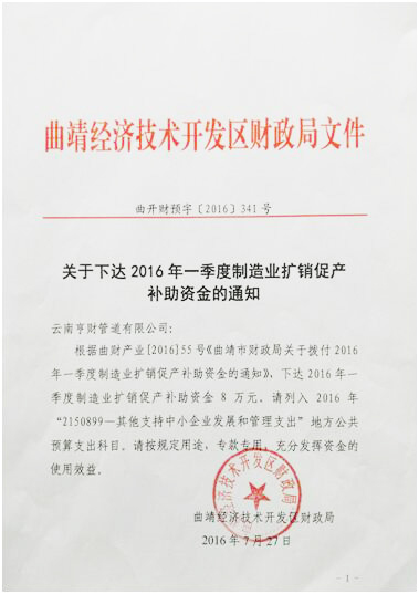 乐鱼网页版登录入口讯 近日,云南曲靖经济技术开发区财政局下发了曲开财预字341号《关于下达2016年一季度制造业扩销促产补助资金的通知》,云南亨财管道有限公司获得2016年一季度制造业扩销促产补助资金8万元。以示对云南亨财管道有限公司的鼓励。