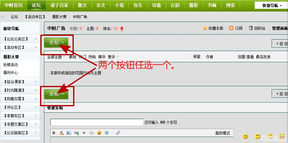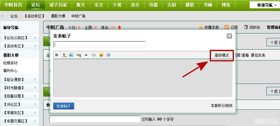 (2)进入相应子版块后,点击“发表帖子”按钮,进入发表帖子模式,再点击右上角的“高级模式”进行编辑。具体见图解如下: