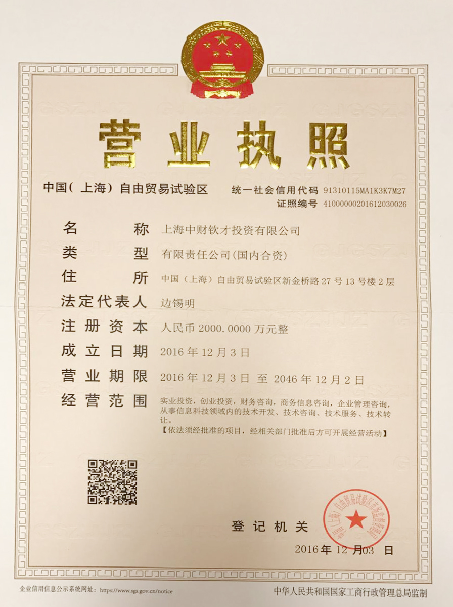 喜讯:上海乐鱼网页版登录入口钦才投资有限公司正式成立