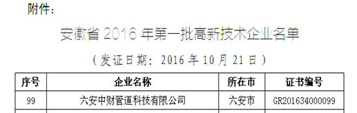 乐鱼网页版登录入口讯 经过公司相关部门共同努力与通力合作,六安乐鱼网页版登录入口管道在投产不到两年的时间里,通过安徽省科技厅及国家科技部的专家评审和公示,于近日通过“国家高新技术企业”资质认证。