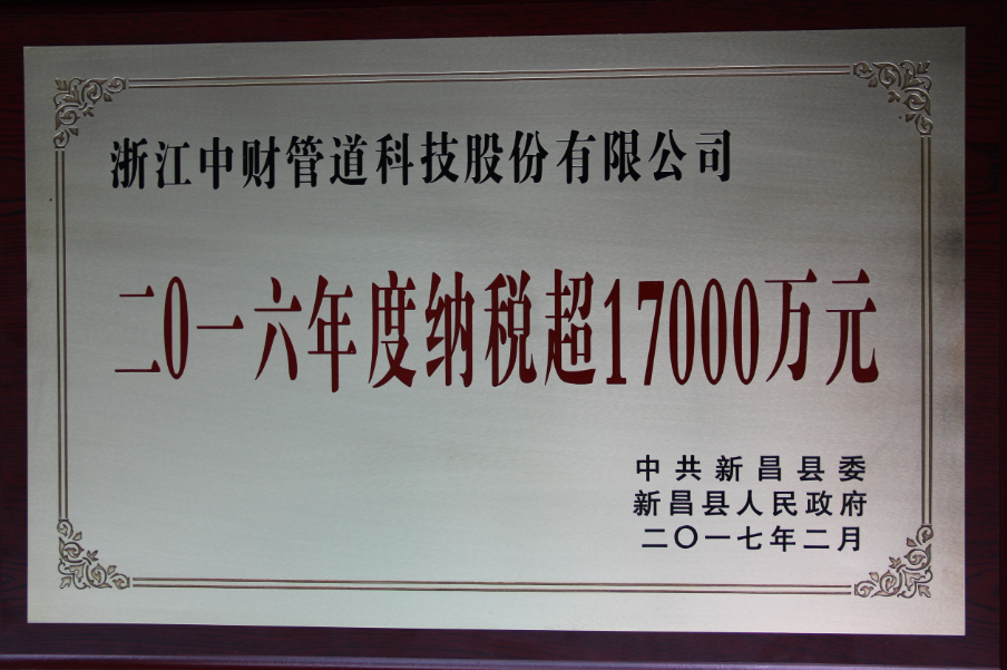 乐鱼网页版登录入口讯 2017年2月3日上午,新昌县委、县政府召开全县经济工作会议。会议隆重表彰2016年度为全县经济发展作出突出贡献的先进个人与集体。浙江乐鱼网页版登录入口管道总经理丁良玉女士荣膺“2016年度新昌县经济发展功臣”称号,浙江乐鱼网页版登录入口管道获颁 “2016年度纳税超1.7亿元”奖牌及“2016年度新昌县税收贡献增长奖”奖牌。