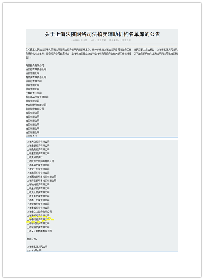 乐鱼网页版登录入口讯 经过不懈努力,2017年2月13日,上海乐鱼网页版登录入口拍卖行有限公司成功纳入上海法院网络司法拍卖辅助机构名单库,为我们拍卖业务的进一步开展打下了良好基础。