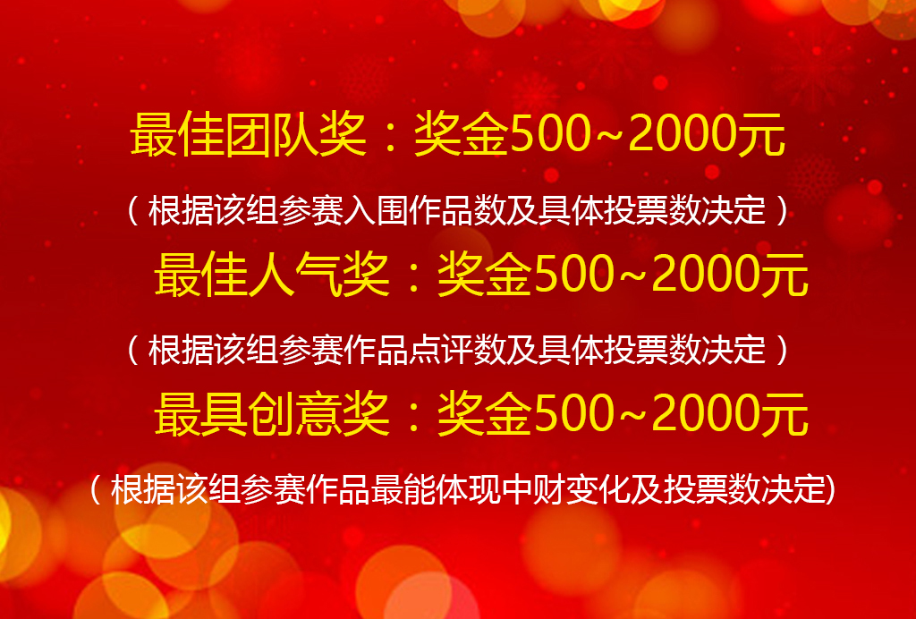 本次比赛,除了高达5000元的一等奖外,还设立了最佳人气奖、最佳团队奖、最具创意奖等奖项,根据互动情况、作品受欢迎程度、作品创意度等等,奖金从500~2000元不等。奖项情况如下图: