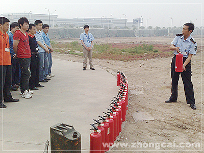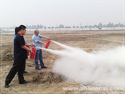 8点30分,参演人员集合完毕,消防班长指导大家灭火器的使用方法。