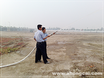 灭火器演示完毕后,保安队伍集结并开始演练使用消防水枪灭火,用标准的动作快速展开消防带。