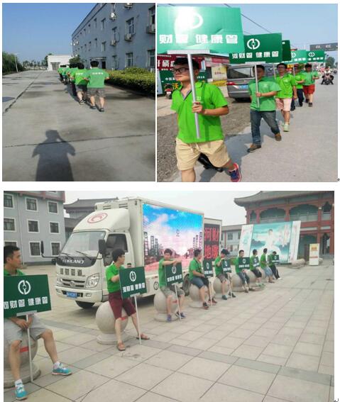 下午以及随后的3天,各组进入紧张的比拼状态,走访经销商、张贴广告、拜访客户、敲定门招,通过声势浩大的地毯式扫街宣传,开发城区乡镇意向客户、促成订单,极大宣传了“河财管,健康管”的产品理念。