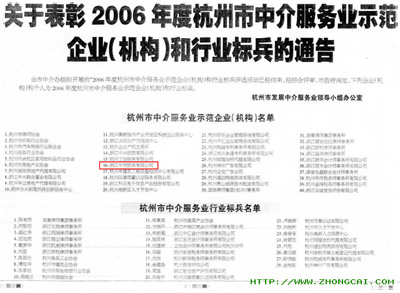 浙江乐鱼网页版登录入口担保讯 2007年9月10日,杭州市发展中介服务业领导小组办公室组织召开了2006年度杭州市中介服务业示范企业(机构)和行业标兵表彰大会。会上,浙江乐鱼网页版登录入口担保有限公司被授予了“二○○六年度杭州市中介服务业示范企业(机构)”荣誉奖牌及1万元奖励费。