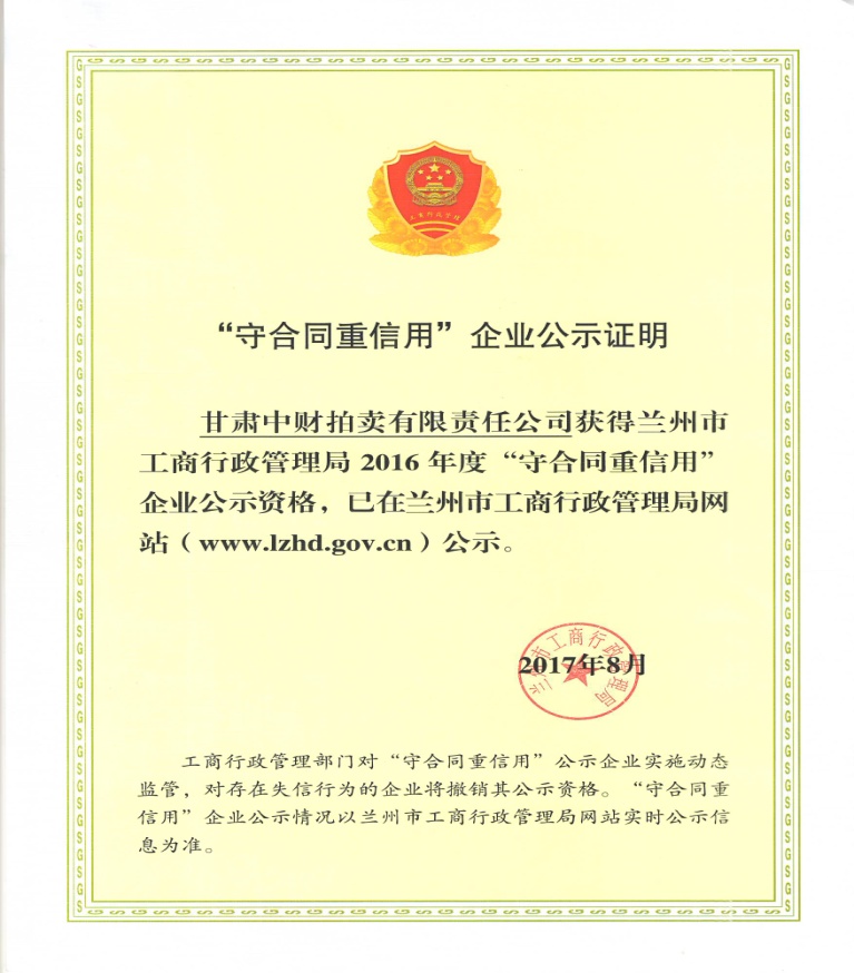 乐鱼网页版登录入口讯 根据《兰州市工商行政管理局关于开展2016年度市级“守合同重信用”企业公示活动及做好2015-2016年度省级“守合同重信用”企业推荐工作的通知》,经兰州市工商行政管理局推荐及及甘肃乐鱼网页版登录入口拍卖工作小组的不懈努力,甘肃乐鱼网页版登录入口拍卖有限责任公司获得2016年度“守合同重信用”企业公示资格,并已在兰州市工商行政管理局网站公示。