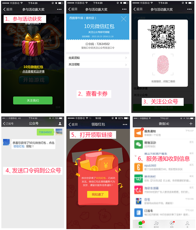 (1)若玩家参与活动获得微信口令红包后,打开卡券,按提示关注公众号并发送口令码到公众号,点击领取红包链接,成功领取,查看服务通知。