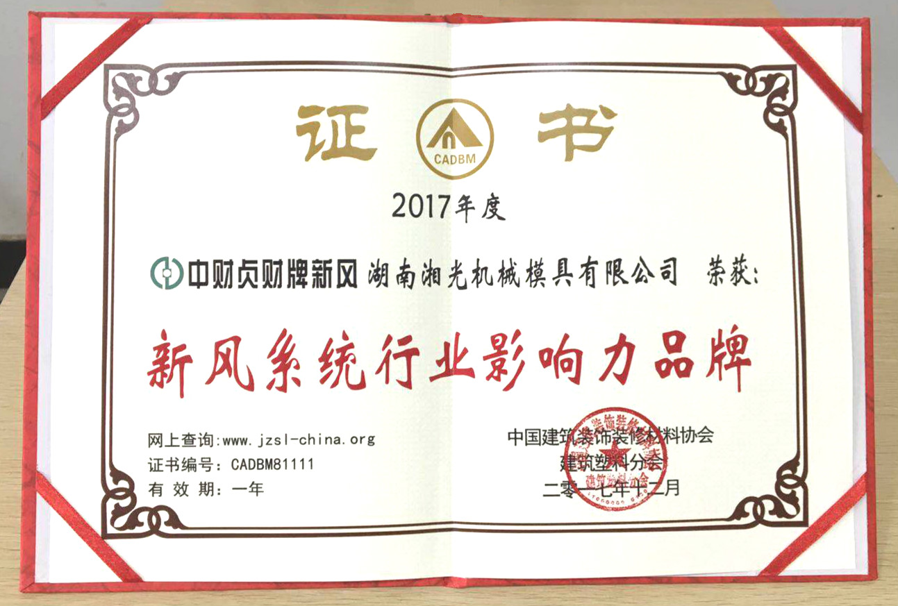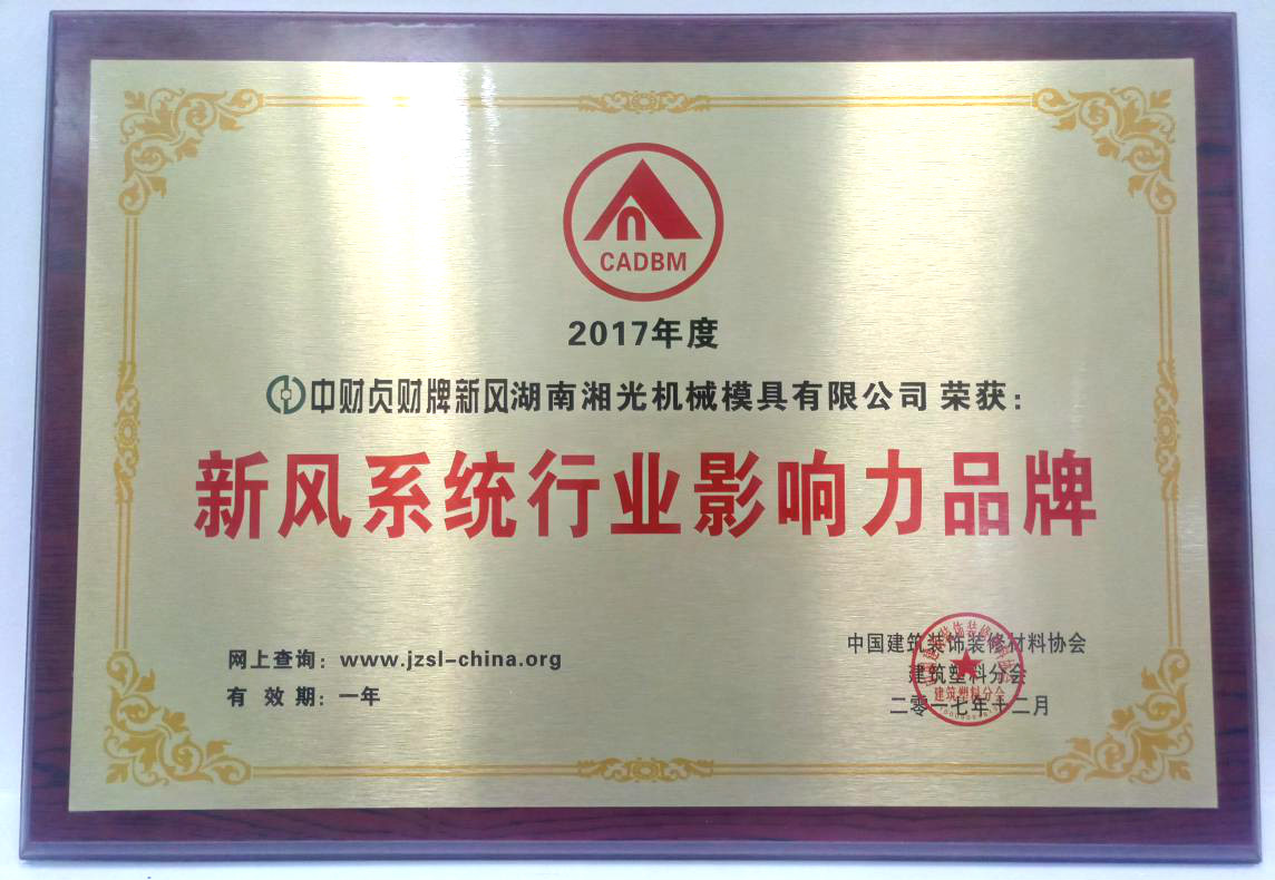 乐鱼网页版登录入口讯 湘光机模研发生产的乐鱼网页版登录入口贞财牌新风系统经中国建筑装饰装修协会推荐评选,获得“2017年度新风行业影响力品牌”荣誉称号。