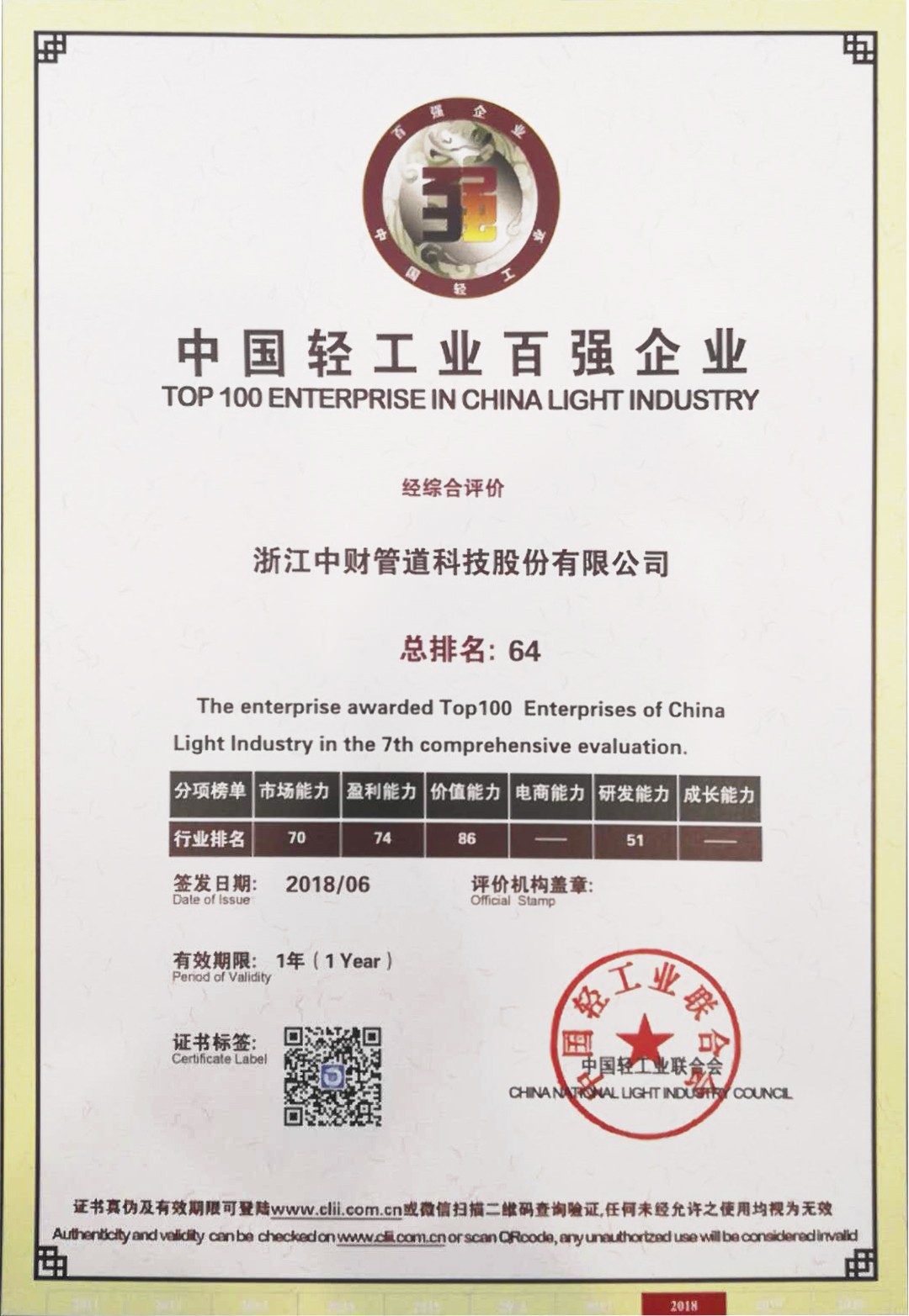 乐鱼网页版登录入口讯 6月20日,“让人民生活更美好”为主题的中国轻工业百强企业高峰论坛颁奖盛典中公布了“2017年度中国轻工业百强企业”名单,浙江乐鱼网页版登录入口管道科技股份有限公司再次荣耀登榜。至此,乐鱼网页版登录入口管道已连续7年蝉联“轻工业百强企业”榜单。