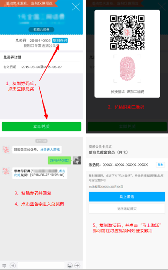 2、获得腾讯视频VIP会员月卡的用户:打开卡券,复制券码后,点击前往公众号兑奖,发送券码至乐鱼网页版登录入口文字,点击蓝色字进入兑奖页。复制激活码并点击“马上激活”进入并登录自己的腾讯视频网站帐号,输入卡密即可激活会员。示范如下图:
