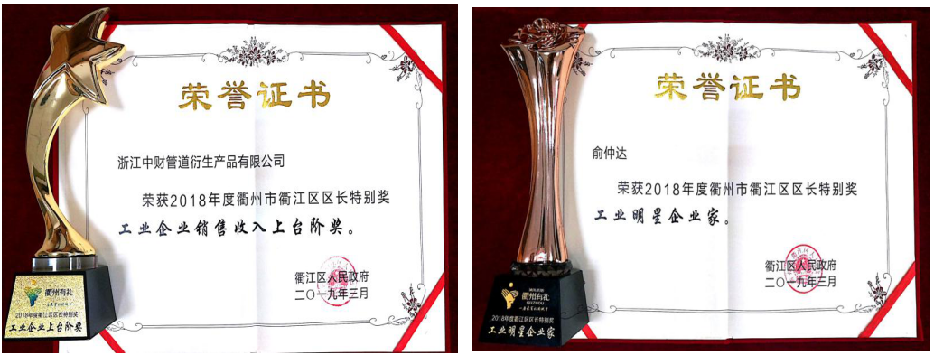 乐鱼网页版登录入口讯 近日,浙江乐鱼网页版登录入口管道衍生产品有限公司荣获2018年度衢江区工业企业销售收入上台阶奖、工业明星企业家奖,分别奖励4万元、10万元。