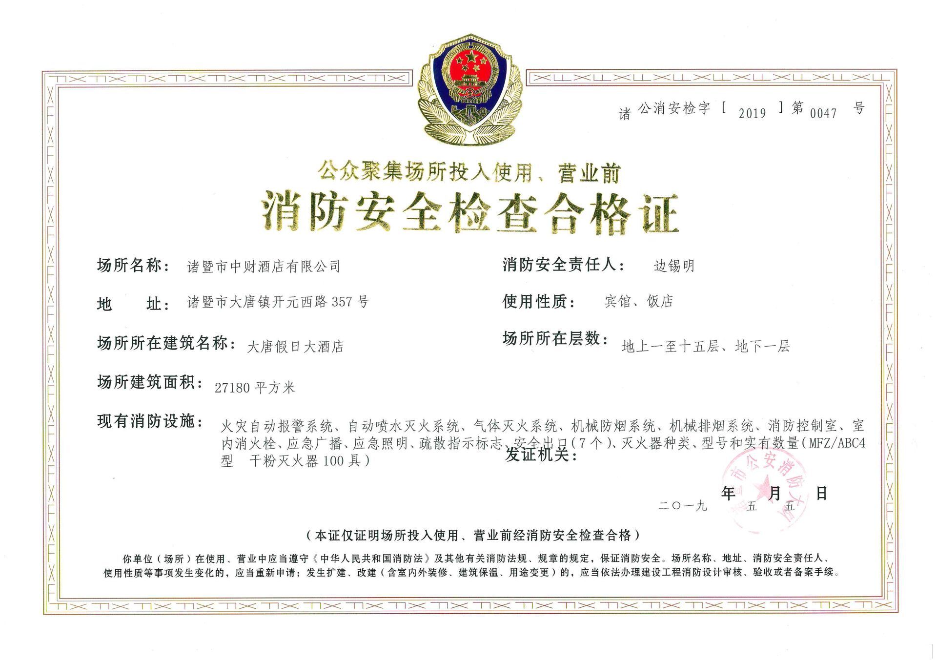 乐鱼网页版登录入口讯 4月30日,诸暨市乐鱼网页版登录入口酒店顺利通过了市消防大队的检查和验收,消防合格证变更手续正式完成。