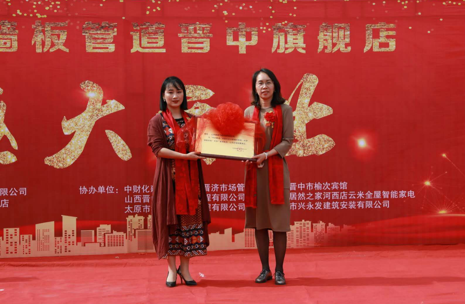 乐鱼网页版登录入口集团型材策划处负责人潘晓华女士(右)为形象店投资人杨莹女士(左)授权