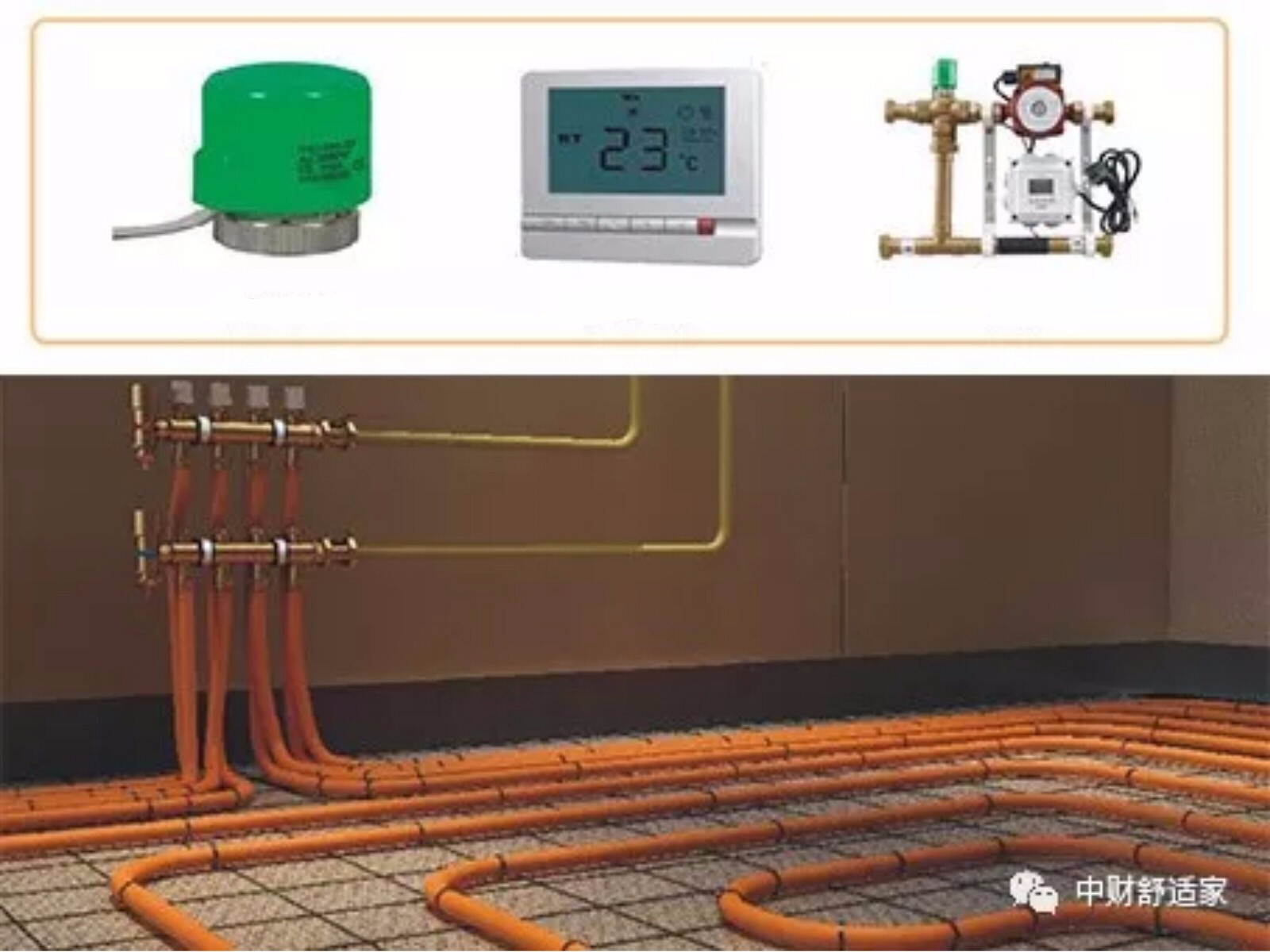 温控部分是地暖系统的温度控制部分,它以房间为供暖区域单元,通过温控器采集室内外温度,实现分时的独立恒温控制,从而使能源得到合理配置,真正实现“既舒适又节能”的目的,温控部分主要由电热执行器和温控面板组成,但可根据实际需求情况配置混水系统。