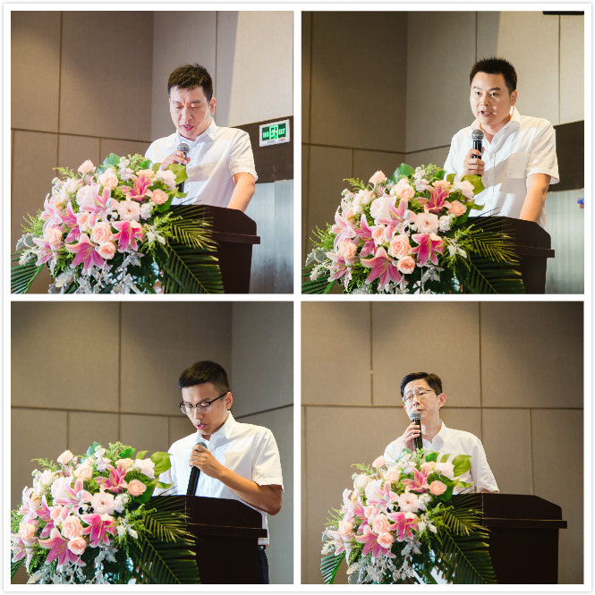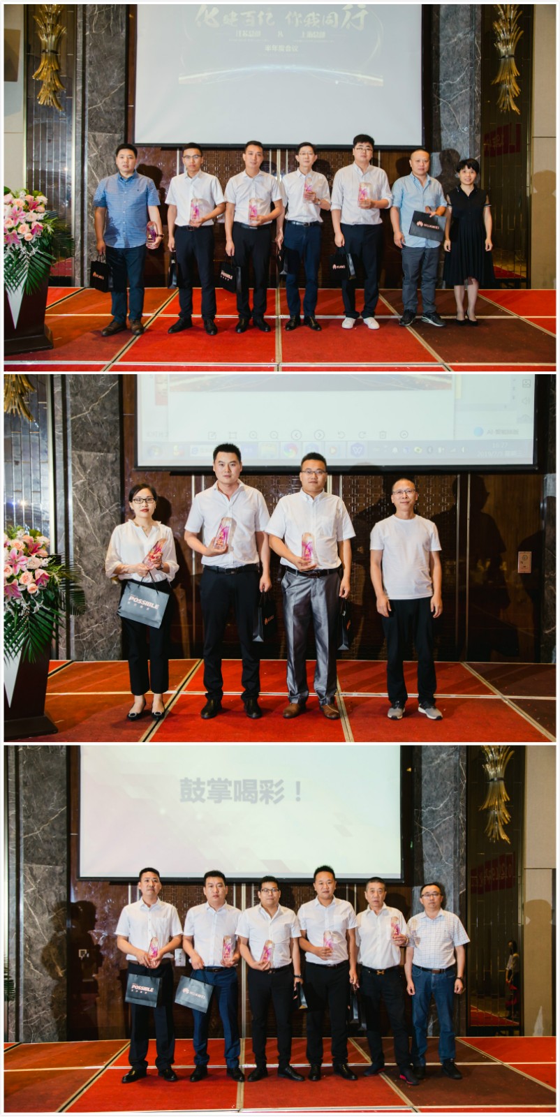 会议对2019年上半年优秀机构进行了表彰,丁总、徐总与王总分别为江苏总部、上海总部的优秀营销机构颁发奖品奖杯并合影留念。