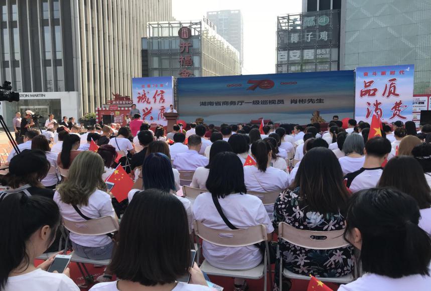 本次“诚信兴商暨质量安全宣传月”活动以诚信经商、品质消费为口号,旨在全省范围内贯彻诚信兴商政策、宣传诚信兴商法规、提高诚信兴商理念、促进诚信兴商建设,倡导诚信经营、引导诚信消费、营造诚实守信的社会氛围。为实现这一既定目标,湖南省商务厅高度重视本场活动,现场国旗飞扬、人头涌动,热闹非凡。此次活动有效推动了全省诚信经营的建设,更是对祖国70周年华诞的一次献礼。