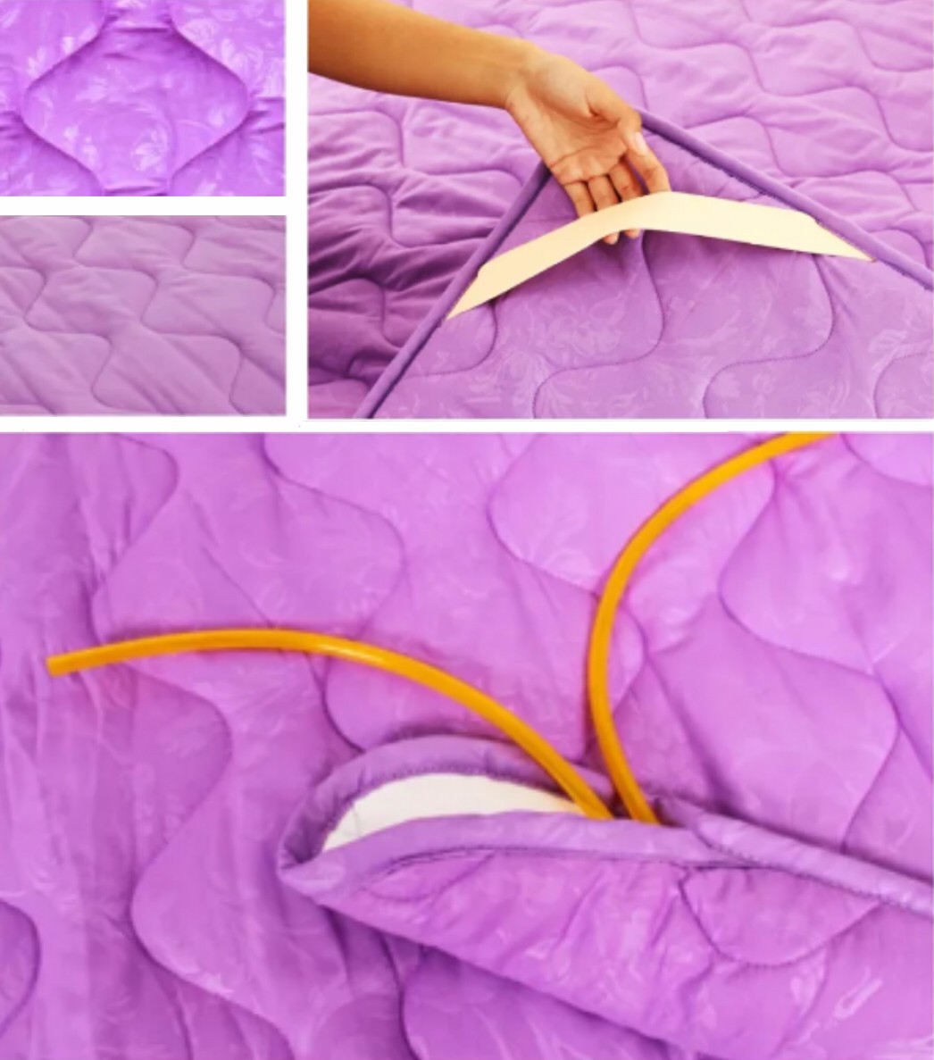 七层结构设计。上层和下层面料由高档涤纶提花面料——保温羽丝绵、无纺布组成,无异味、不起球、不变形、透气亲肤,体感舒适度好。保温羽丝绵可减少热量损失;中间层为硬质棉(代棕棉)基材具有缓冲作用,不易滋生细菌。采用隐形水管开槽结构处理,解决水管突出问题,体感舒适,无异物感。