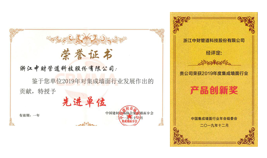 会议对优秀企业进行表彰,鉴于对2019年度集成墙面行业发展的突出贡献和产品创新,浙江乐鱼网页版登录入口管道科技股份有限公司被授予“先进单位”、“产品创新奖”等荣誉称号。