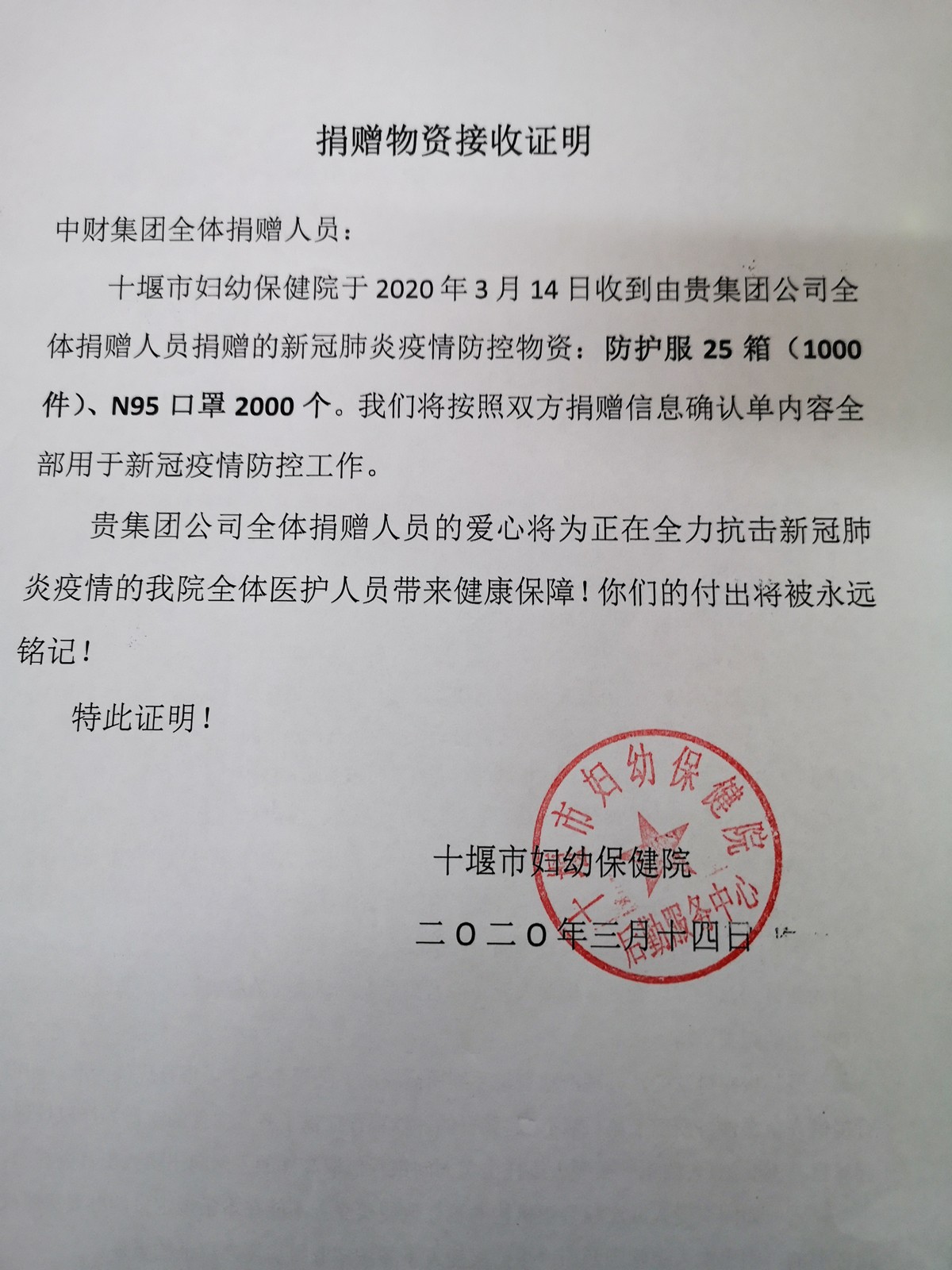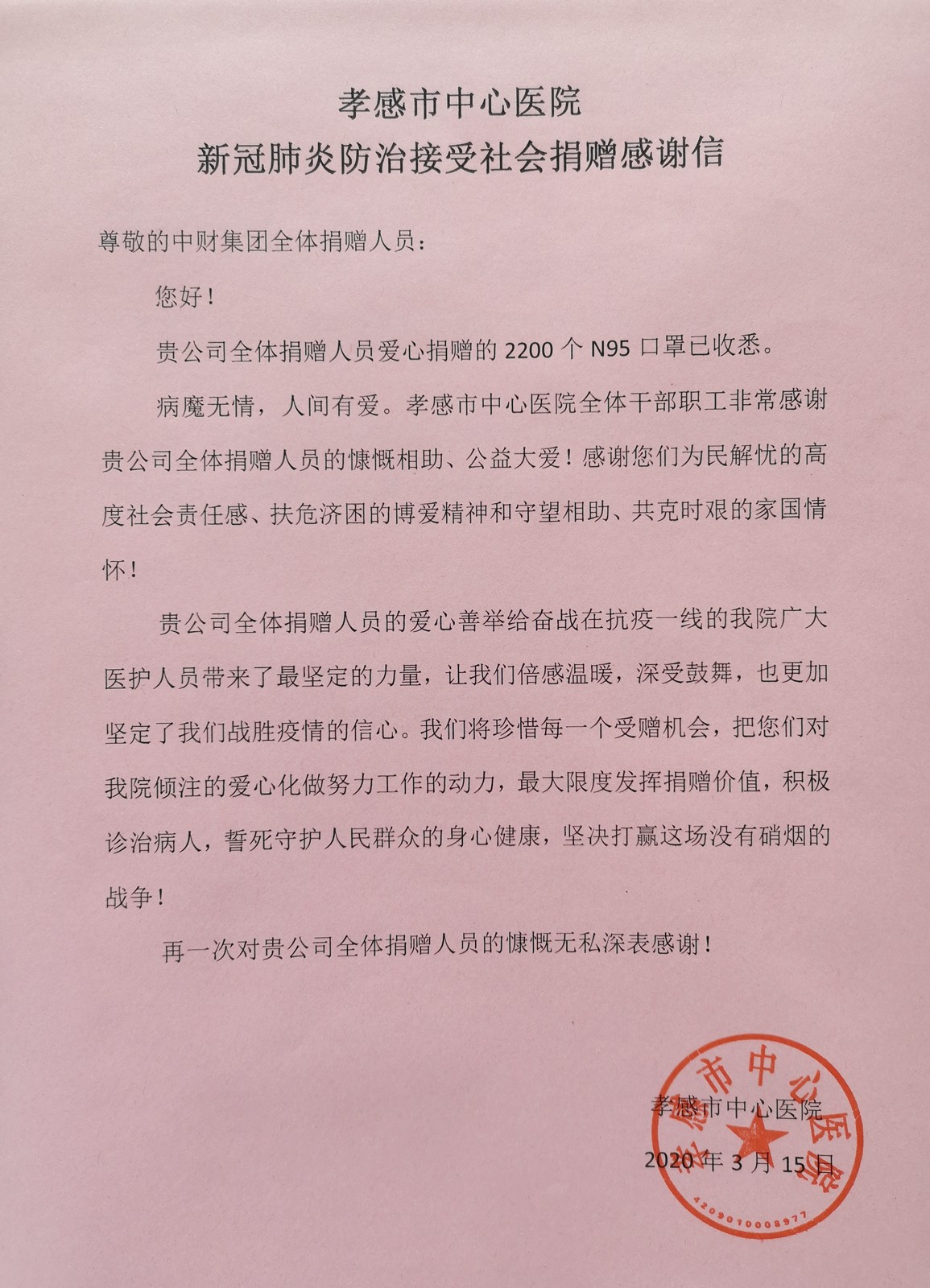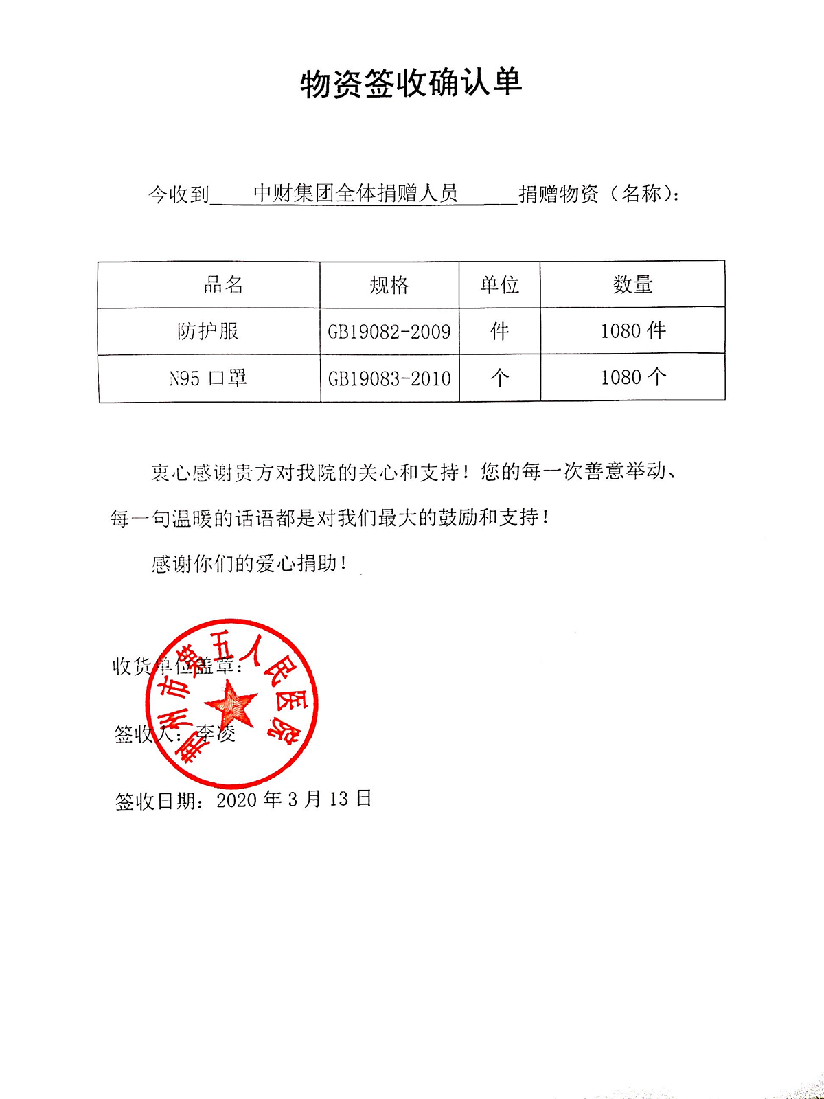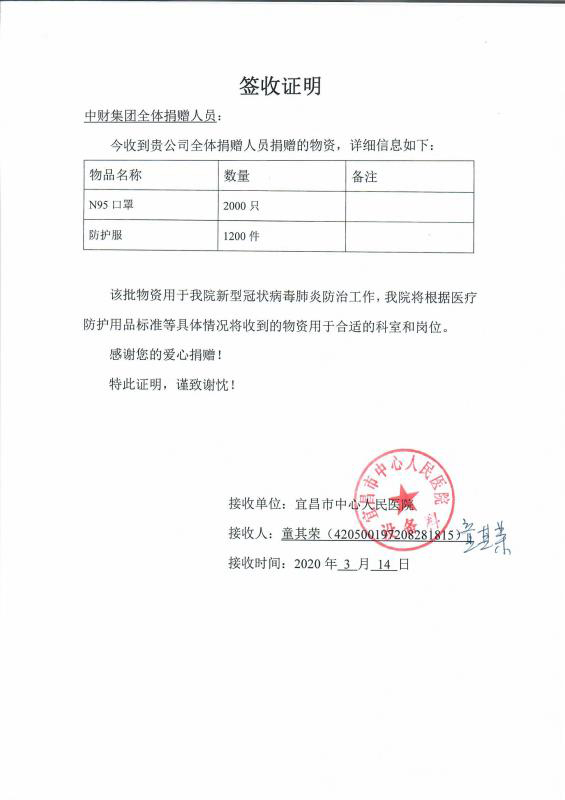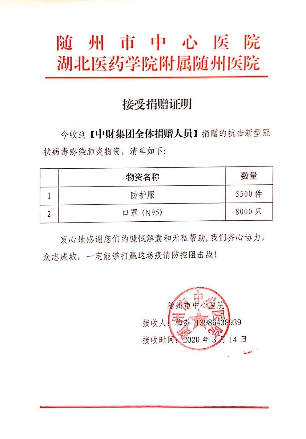 本次捐赠,经深入调研有关抗疫医院的需求,按急需捐赠,确保合理使用善款。共计捐赠医用N95口罩10万个和防护服5万件。医院接收捐赠物资的书面回执也正在陆续反馈中,截至3月15日,已收到11家。